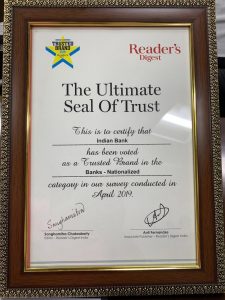 इंडियन बैंक को ‘ट्रस्टेड ब्रांड्स 2019 ’ के तहत रीडर्स डाइजेस्ट द्वारा भारत में सबसे भरोसेमंद ब्रांडों में से एक चुना गया है।