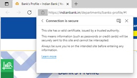 - अब फ़िशर्स और जालसाज़ों के लिए संगठन के ब्रांड को हाईजैक करना मुश्किल बनाने हेतु हमने अपनी वेबसाइट के लिए एक्सटेंडेड वैलिडेशन सिक्योर सॉकेट लेयर सर्टिफिकेट [ईवी एसएसएल] का इस्तेमाल किया है। और जब कभी भी, हमारी वेबसाइट एक्सेस की जाती है, नवीनतम ब्राउज़र एड्रेस बार को विशिष्ट लॉक सिंबल ट्रिगर करता हैं। माइक्रोसॉफ्ट® एड्ज ब्राउज़र, फ़ायरफ़ॉक्स, ओपेरा जैसे ब्राउज़रों का उच्च संस्करण इस विस्तारित सत्यापन एसएसएल सुविधा का सहयोग करेगा और लॉक को ट्रिगर करेगा। इसलिए ब्राउज़रों के नए/उन्नत संस्करणों का उपयोग करें क्योंकि वे आपको फ़िशिंग साइटों तक पहुँचने से रोकने और सतर्क करने के लिए नियमित रूप से अपडेट किए जाते हैं। विस्तारित सत्यापन एसएसएल सुविधा जो अब हमारी इंटरनेट बैंकिंग वेबसाइट में उपलब्ध है [एज ब्राउज़र] के नीचे प्रदर्शित की गई है।